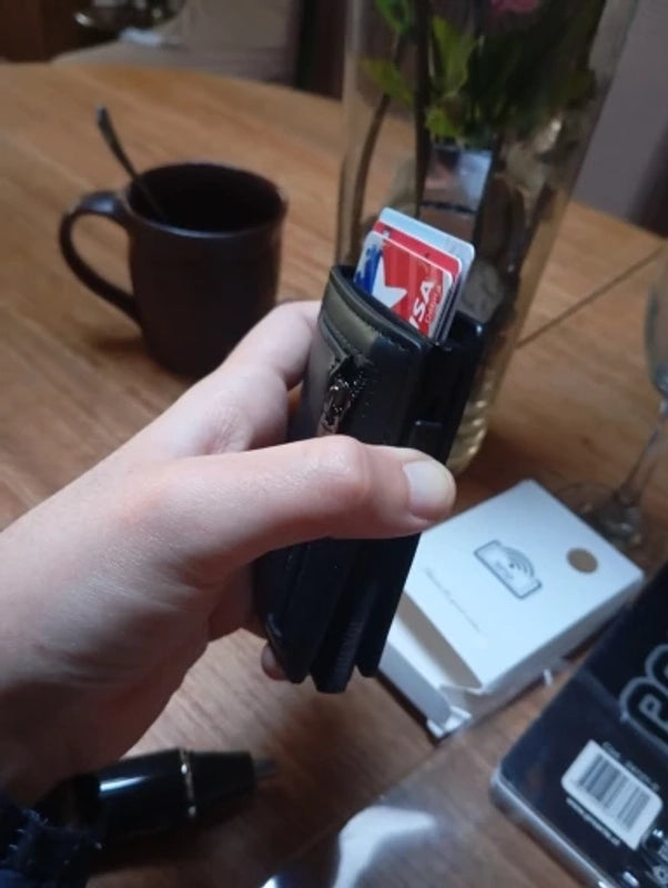 Das Wallet bietet Platz für insgesamt bis zu 11 Karten. Davon lassen sich bis zu 7 Karten im Aluminiumfach verstauen und per Knopfdruck fächerförmig ausgeben.